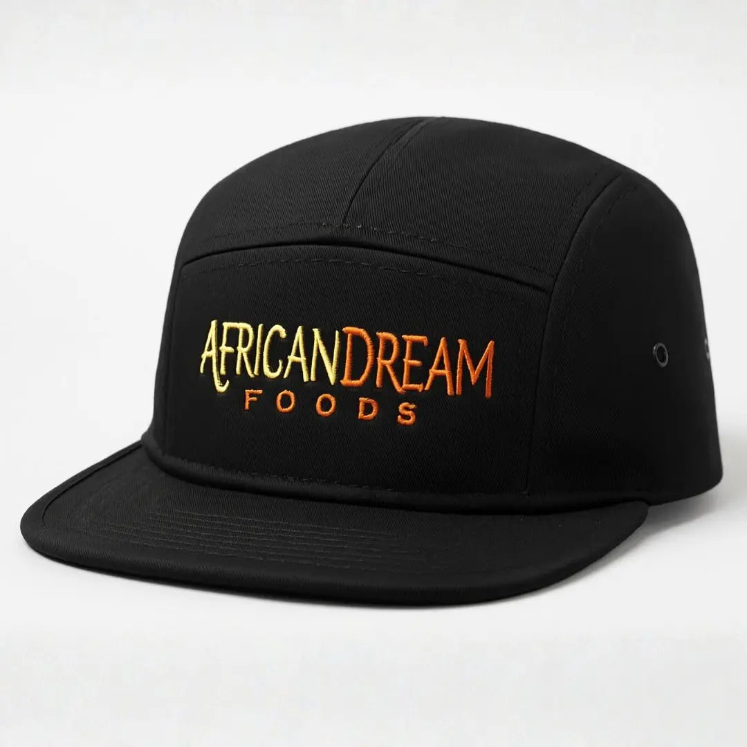 A clean and classic 5-panel cap with a bold twist. Featuring the African Dream Foods logo embroidered in gradient flame tones, this black cap is an easy go-to for spice lovers who like to keep things sharp and simple. The structured fit and flat brim make it ideal for everyday wear, whether you’re repping your favorite hot sauce brand or just keeping the sun off your face.